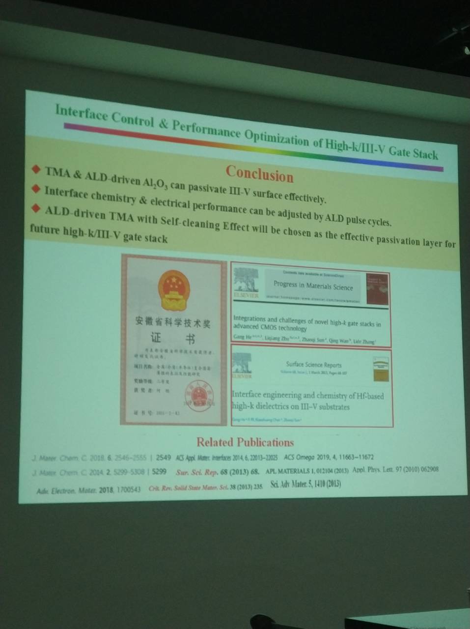 会议伊始,主持人为在座师生介绍了何刚教授的学习与工作经历,大家报以热烈掌声欢迎何教授的到来。何刚教授任安徽大学物理与材料科学学院教授。主要从事新型高k栅介质的设计、制备及与器件集成相关的科研工作。主要的研究内容:新型高k栅的掺杂设计及结构优化、高k栅的界面钝化、以及高k栅在场效应器件与薄膜晶体管方面的应用等。何刚教授多次应邀在国际学术会议上作邀请报告,并多次组织学术会议。迄今为止,已在Pro. Mater. Sci, Sur. Sci. Rep, Adv. Electro Mater, Appl. Phys. Lett, Phy. Rev. B, Phys. Rev. Appl.等国际学术期刊上发表SCI论文200余篇。发表论文总被Nature Mater., J. Am. Chem. Soc., Adv. Funct. Mater.等国际学术期刊论文引用3100余次,H因子27;主持国家自然科学基金、教育部重点项目、安徽省自然基金等项目。安徽省自然科学二等奖获得者(排名第一)。然后,何刚教授开始详细的向各位师生做报告。首先给大家介绍了高k栅介质的研究背景及他们在硅基高k栅材料选择及界面修饰方面的研究工作。另一方面,针对高k栅介质本身的缺陷及硅基的服役周期物理问题,介绍他们在高迁移沟道材料与高k栅异质集成方面的研究工作。最后,结合新型高k栅的优势,介绍他们目前在薄膜晶体管方面取得的部分研究进展。