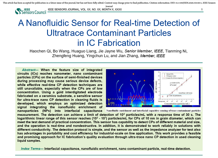 近日,我院系统结构研究室实现了一种用于IC工艺清洗液中超痕量纳米污染物检测的先进传感器,将纳米流体富集与传感器pF级界面电容测量相结合,可达到102 particles/mL的检测限,传感器响应时间短至30秒。对于粒径为10nm的污染物颗粒,线性检测区间达(102~ 107) particles/mL,性能达到已报导相关技术的领先水平。该传感器及检测方案是简便、实时且无损的,可满足实际IC工艺中的在线良率提升的技术需求。