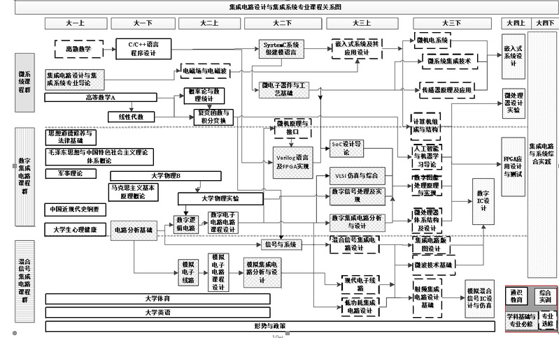 建立三大课程组:微系统课程组、数字集成电路课程组、混合信号集成电路课程组。所有课程及各课程组的课程关系图如下图所示。