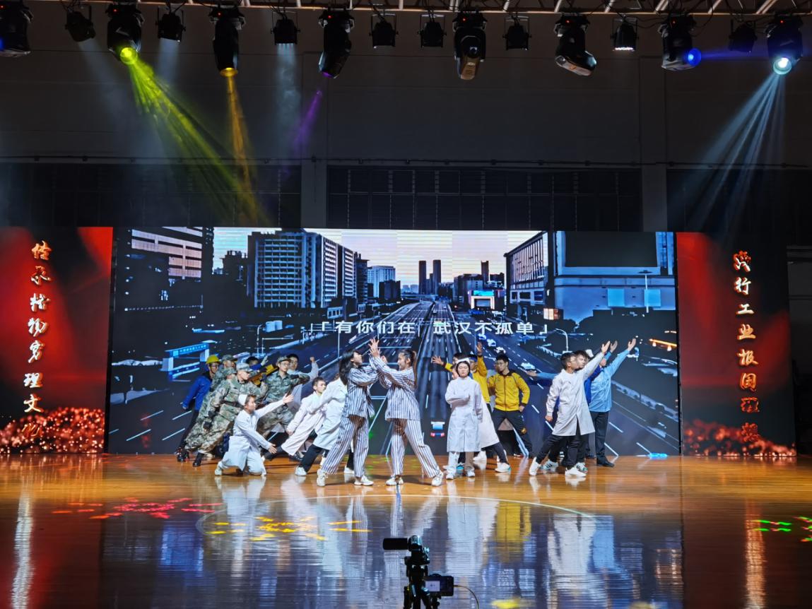万众一心,抗疫前行。抗疫情景剧《火神山的防疫故事》讲述了1月23日武汉火神山医院建设任务下达之后,身为党员的主人公暂别病重的家人,争分夺秒奔赴一线,进行建设任务,舍弃小我、成就大我的感人故事。情景剧末尾,一首《stay with you 》(与你同在),歌声温暖而又坚定。每个时代,都有每个时代的英雄,舞蹈《最美逆行者》,同学们身着各行各业工作者的服装,用舞蹈展示疫情来临之时,军人、医护人员、建设人员、外卖小哥以及其他奋战在一线的工作人员如何负重前行、逆流而上,他们,就是我们这个时代的英雄。
