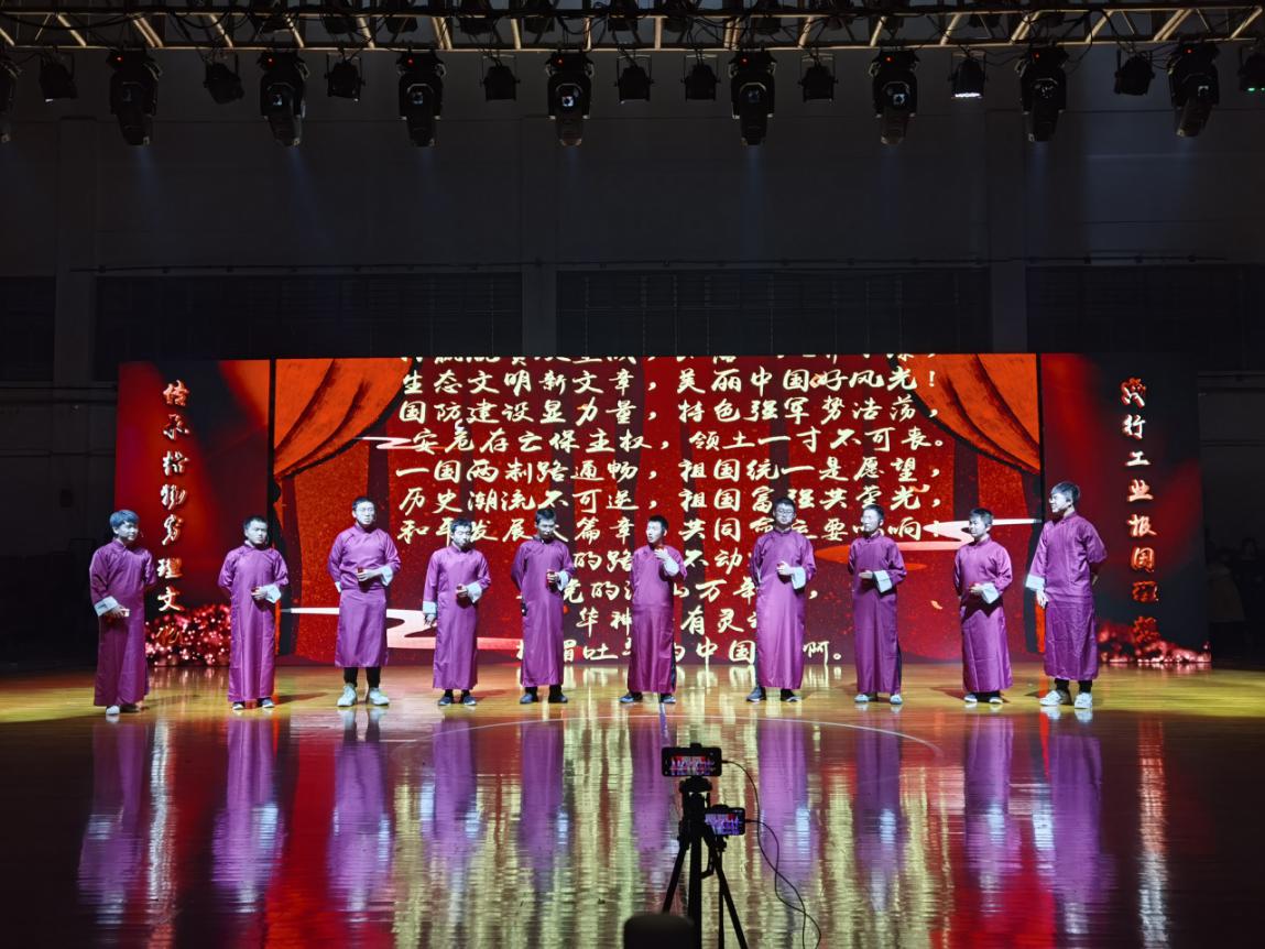 中华神韵,砥砺奋进。小品《你的模样》讲述了在乡村奋斗几十年的老校长迎接几位刚刚毕业的大学生们到乡村支教的故事,同学们绘声绘色的表演将心系祖国、甘于奉献的“小人物”形象刻画的淋漓尽致,充分展现出“小人物”蕴含的“大能量”。五十六个民族五十六朵花,民族舞《欢乐》,少数民族的同胞们用曼妙的舞姿演绎民族大团结的华章。相声《中华神韵》,同学们打起竹板,讲述中国共产党如何引领中华民族从苦难走向辉煌的99年光辉历程。在学院党委的领导下,青年学子必将勤学苦练、奋发向上,传承格物穷理文化,践行工业报国理想。