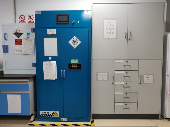 五、实验室化学试剂和药品(如图5):实验室化学试剂和药品分类存放于专用试剂柜,管制类药品用专用试剂柜并实现双锁管理,易燃、易爆、腐蚀性的危化品,按要求分类放置于防爆柜和酸碱柜中,试剂柜上张贴药品清单,并悬挂领用记录,记录完整。
