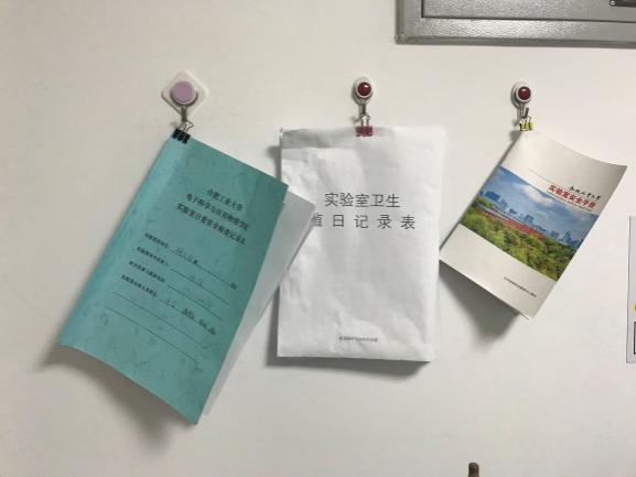 二、实验室日常管理(如图2):实验室门口悬挂着实验室安全检查记录本、实验室卫生值日记录本、实验室安全手册,并在门口显著位置张贴黄色警示“离开实验室请关闭水电气关好门窗”。