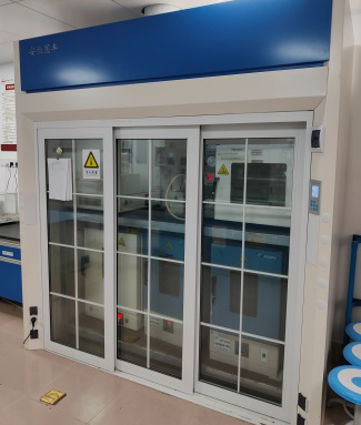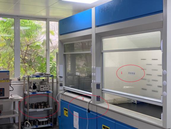 三、实验室通风橱柜(如图3):1、通风橱内,柜面整洁无尘,柜门上“轻拉轻放”的字样,格外温馨;2、实验耗材和元器件整齐排列在储物架上;3、通风橱内的常驻仪器的电源线非常整齐地摆放在醒目位置;4、需要排风的实验设备有序摆放在通风柜内。