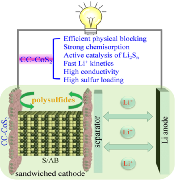 该工作基于CoS2纳米颗粒修饰的柔性自支撑碳布(CC-CoS2),设计一种三明治结构锂硫正极(CC-CoS2@S/AB@CC-CoS2),具有以下优势:(1)CC具有3D导电网络以及足够的空隙,不仅可以促进电子传输、提高硫负载量,而且能有效地缓释充放电过程中的体积膨胀;(2)均匀覆盖的CoS2纳米颗粒具有良好的极性和催化活性,能显著增强对可溶性多硫化锂的化学吸附,提高S8-Li2Sn-Li2S多步转化反应动力学;(3)三明治结构正极能有效抑制多硫离子的“穿梭效应”。该锂硫正极有效提高了锂硫电池的循环性能和倍率性能,对于硫负载为1.2 mg cm−2 的电池,在高倍率4C(1C = 1675 mA/g)下的比容量为823 mAh g−1,并呈现出优异的循环稳定性,循环1000圈电池容量衰减率仅为每圈0.021%。当硫负载高达4.2和 6.1 mg cm−2时,电池在0.2 C下的首圈放电比容量分别为1097和897 mAh g−1,循环100圈后容量未衰减。该研究工作为开发高性能锂硫电池提供了一种新的思路。