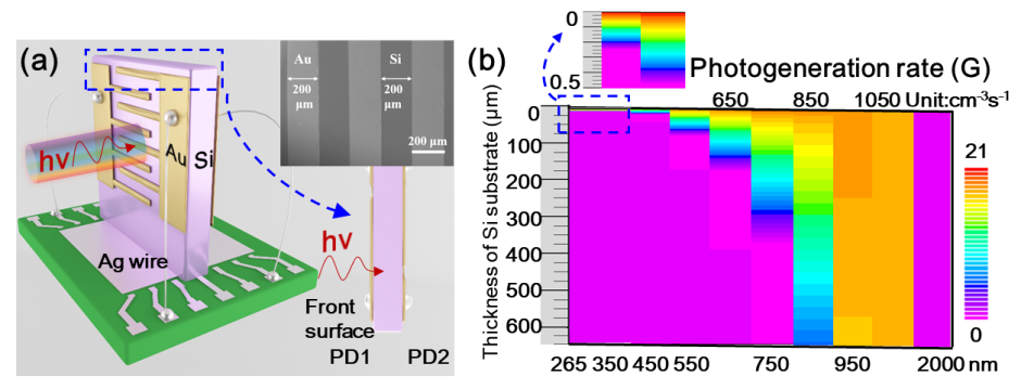 图1. (a)波长传感器结构示意图,两个Au/n-Si/Au光电探测器位于硅晶圆片的两侧,插图显示了单个Au/n-Si/Au光电探测器的FESEM图片。(b)通过TCAD仿真600 μm厚的硅衬底上265-2000 nm波长的光对应的光产生率。