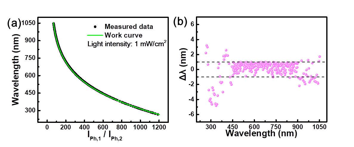 为了解决上述问题,近日,我院先进半导体器件与光电集成实验室罗林保教授提出了一种新的具有简易结构的波长传感器,该传感器由两个相同的背对背肖特基结光电探测器组成(图1a)。根据计算机辅助设计技术(TCAD)模拟,由于硅的吸收系数与入射光波长存在依赖性,两种光电探测器在不同波长照射下的光吸收率存在巨大差异(图1b)。这种光电特性使得两个器件的光电流比与波长之间存在单调函数关系,通过该函数可以定量计算出入射光的波长(图2a)。进一步的器件分析表明,波长传感器能够区分紫外到近红外(265-1050 nm)范围内的波长。特别是,在450-900 nm的波长范围内,波长分辨率可达~1 nm,远优于之前报告的结果(图2b)。这些优异的器件性能指标以及简易的器件结构使其在下一代光电子器件中具有潜在的应用价值。