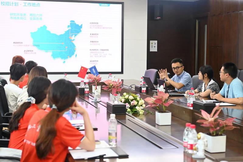 参观结束后,开展校友座谈活动。宇视科技人力资源处相关负责人对学校一行人来访表示诚挚欢迎,并详细介绍了公司发展现状,成长历程、业务领域以及人才需求等,并从面试常见十个问题角度向同学们传授了面试技巧。随后,同学们与纷纷提出自己的问题,老师和学长们均悉心解答,双方交流融洽。