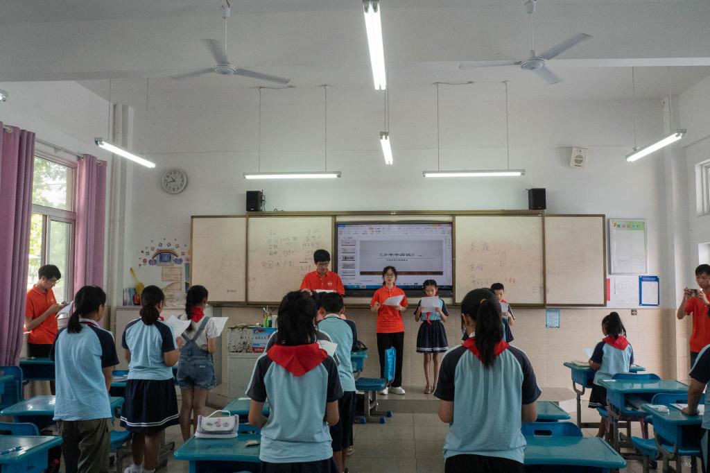 7月22日,实践活动进入尾声,在当天的课堂生,师生共同朗诵的《少年中国说》情感充沛、气势如虹;孩子们齐唱着《我和我的祖国》,用歌声为实践团送行。临别之际,实践团成员与孩子们依依惜别,互送祝福。