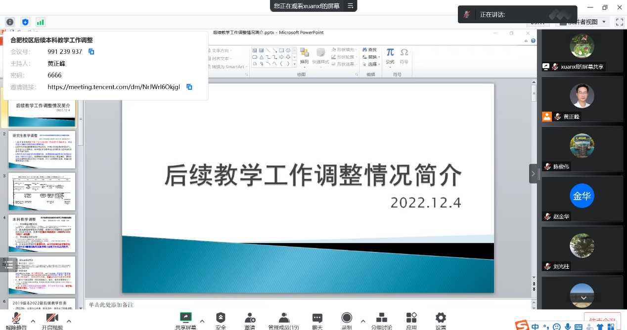接本科生院《关于合肥校区后续本科教学工作调整的通知》、研究生院《关于2022年秋季学期研究生教学工作调整与安排》通知后,为迅速完成学校下达的任务安排,保证教学环节持续平稳运行,我院召开了后续教学工作调整线上协调会。会议由教学副院长黄正峰教授主持,全体教师参加了会议。
