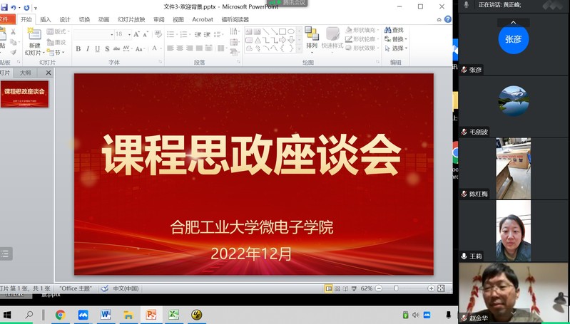 其他课程思政项目老师结合具体课程,围绕课程思政建设有关情况进行深入研讨交流。黄文老师介绍,《微电子器件与工艺》课程思政项目建设比较早,课程建设目的很明确,除了帮助学生系统学习知识体系,还要挖掘用好课程融入的思想政治教育元素,如解决电子元器件行业‘卡脖子’难题,充分发挥课程的思想政治教育功能,促进学生加深学科理解。张章老师分享了如何结合《模拟电子技术基础》课程知识传授来激发学生的爱国情怀。王莉老师以《半导体物理》课程为载体,探讨如何挖掘课程蕴涵的人文元素的路径和方法。陈红梅从应为国家培养什么样的人才入手,通过优化教学内容、教学方法将课程思政融入其主讲的《模拟电子线路》课程中。