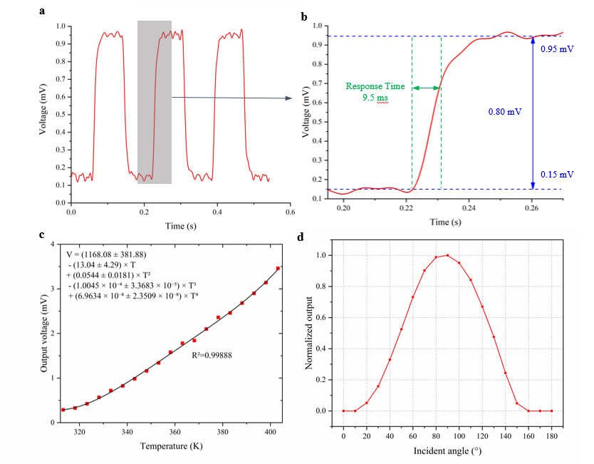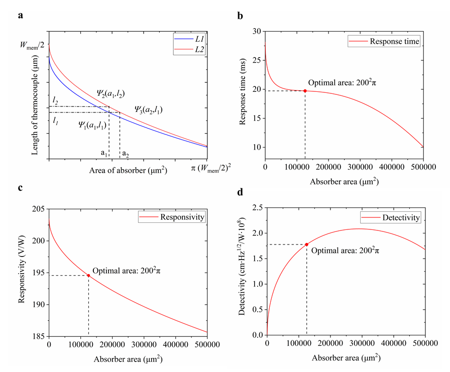 研究将传统的四端梁结构与径向分布结构进行了建模和仿真比较,结果表明,后者的设计提高了输出电压,并显著改善了响应率和检测率,分别提高40.5%和43.8%。实验测得该探测器在室温下的快速响应时间为9.5毫秒,响应率为 100.6 V/W,探测率为 5.2×107 cm∙Hz1/2/W。本研究为提高热电堆红外探测器的性能提供了一种新颖而有效的解决方案,在未来高速热成像和动态热分析中,具有巨大的潜力。上述研究工作得到了国家重点研发计划、和安徽省重大研发创新专项资金等的资助。