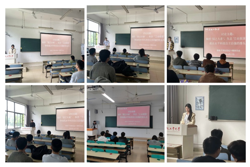 4月17日至24日期间,学院第71期发展对象班学员、党员班学员分别在翡翠科教楼十二教201、十二教202、十一教106、十一教206组织开展了以“胸怀国之大者,矢志工业报国,争做高水平科技自立自强的排头兵”为主题的专题学习研活动。