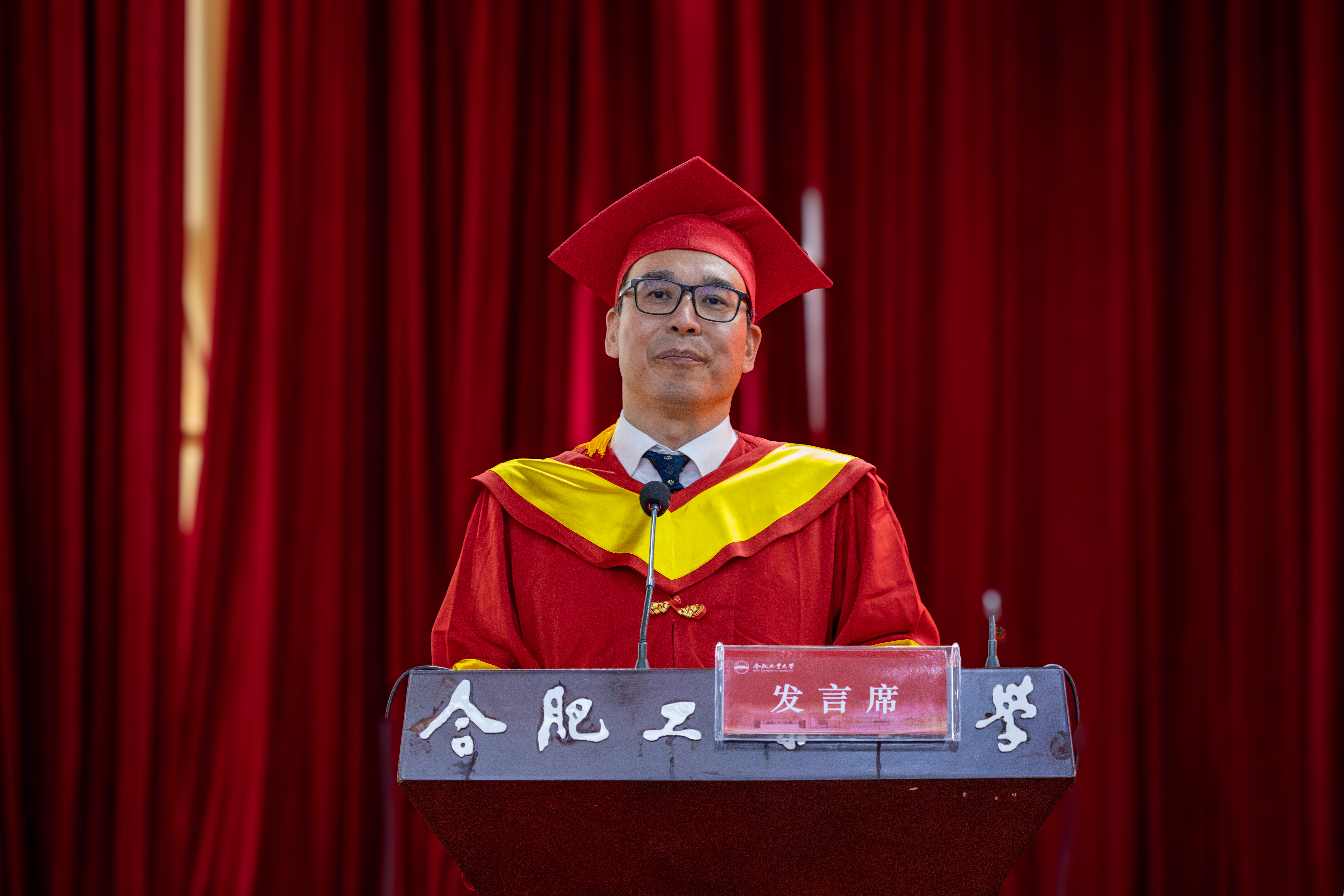 教师代表黄文教授向即将迈出校园的毕业生们致以祝贺和祝福,他鼓励全体毕业生在为梦想不懈奋斗的同时,能够从容面对世界的多样性和生活的偶然性,勇敢地探索属于自己独特的人生道路;保持对知识的渴望,对事业的执着,并始终怀抱创新精神,做一个有担当、有情怀、有责任感的时代青年。