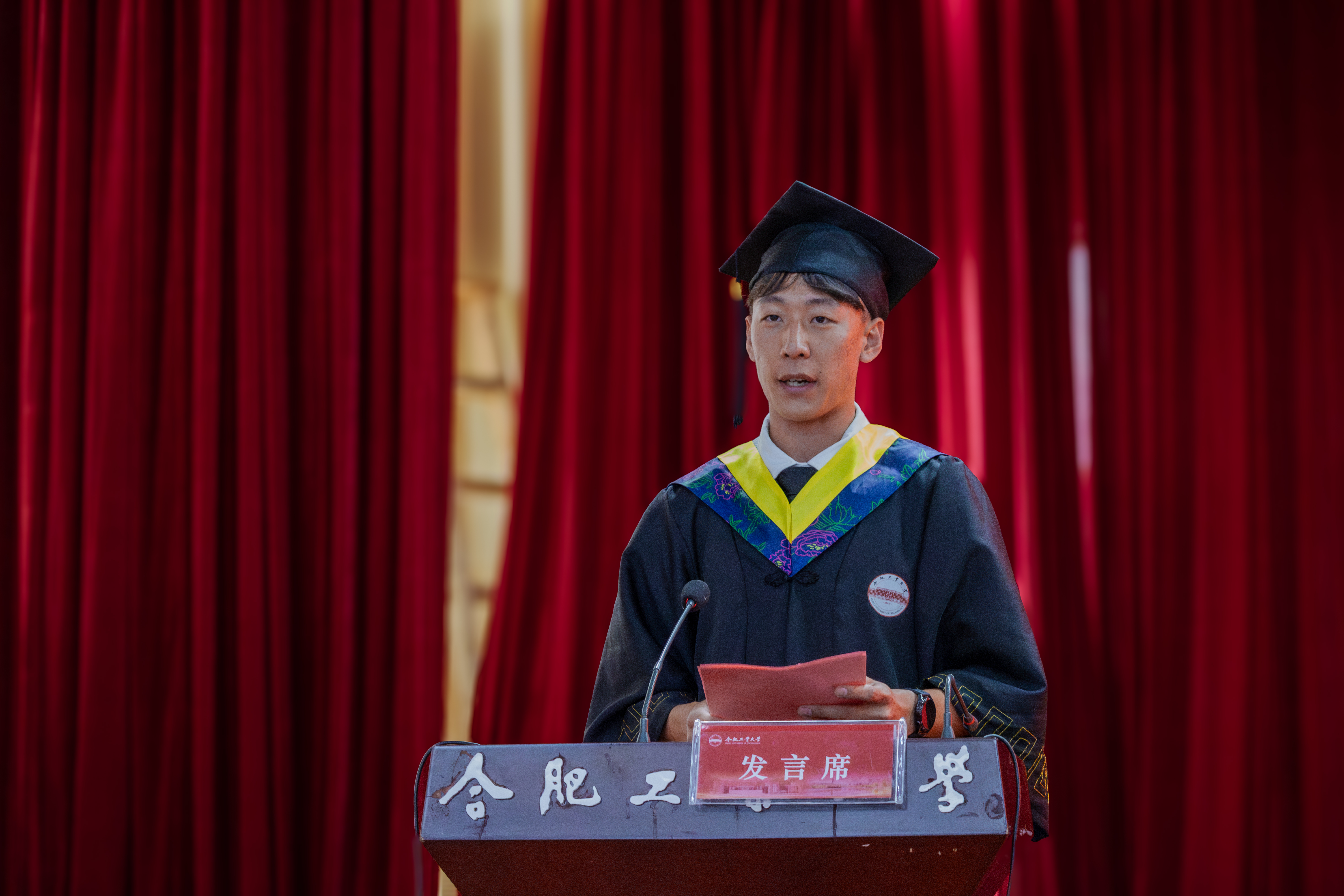 安徽省优秀毕业生、必赢线路检测3003no1校长奖获得者、集成电路设计与集成系统专业本科生党支部副书记赵文尧同学作为毕业生代表发言。他在发言中感恩母校的培育培养、感恩老师的辛勤指导,并代表广大全体毕业生向母校保证,将勇敢承担起母校领导、老师们的殷切期望和深情嘱托,继续发扬工大人的优良传统和务实作风,立大志、明大德、成大才、担大任,勇担时代赋予的历史重任,精进知微,胸怀天下,坚定向前,用青春书写华彩篇章。