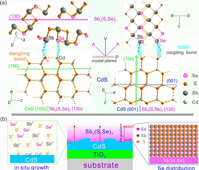 图2. Sb2(S,Se)3/CdS异质结界面原子结构特性及Se元素浓度梯度分布示意图