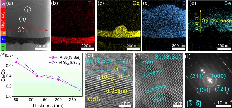 图1. 硒硫化锑半导体薄膜相关特性表征及Se元素浓度梯度分布