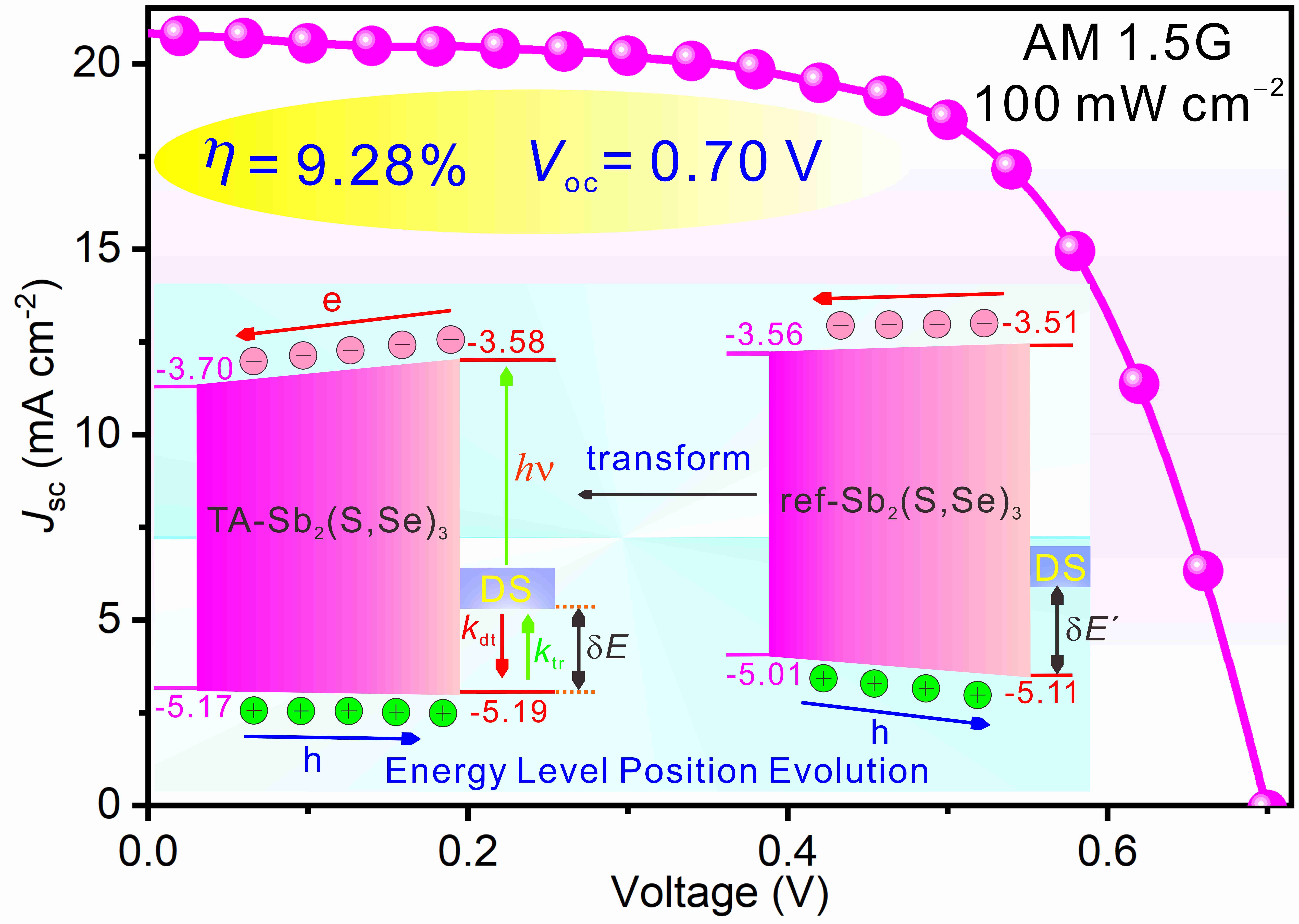 图3. Sb2(S,Se)3光伏器件J-V性能及能级结构演变图