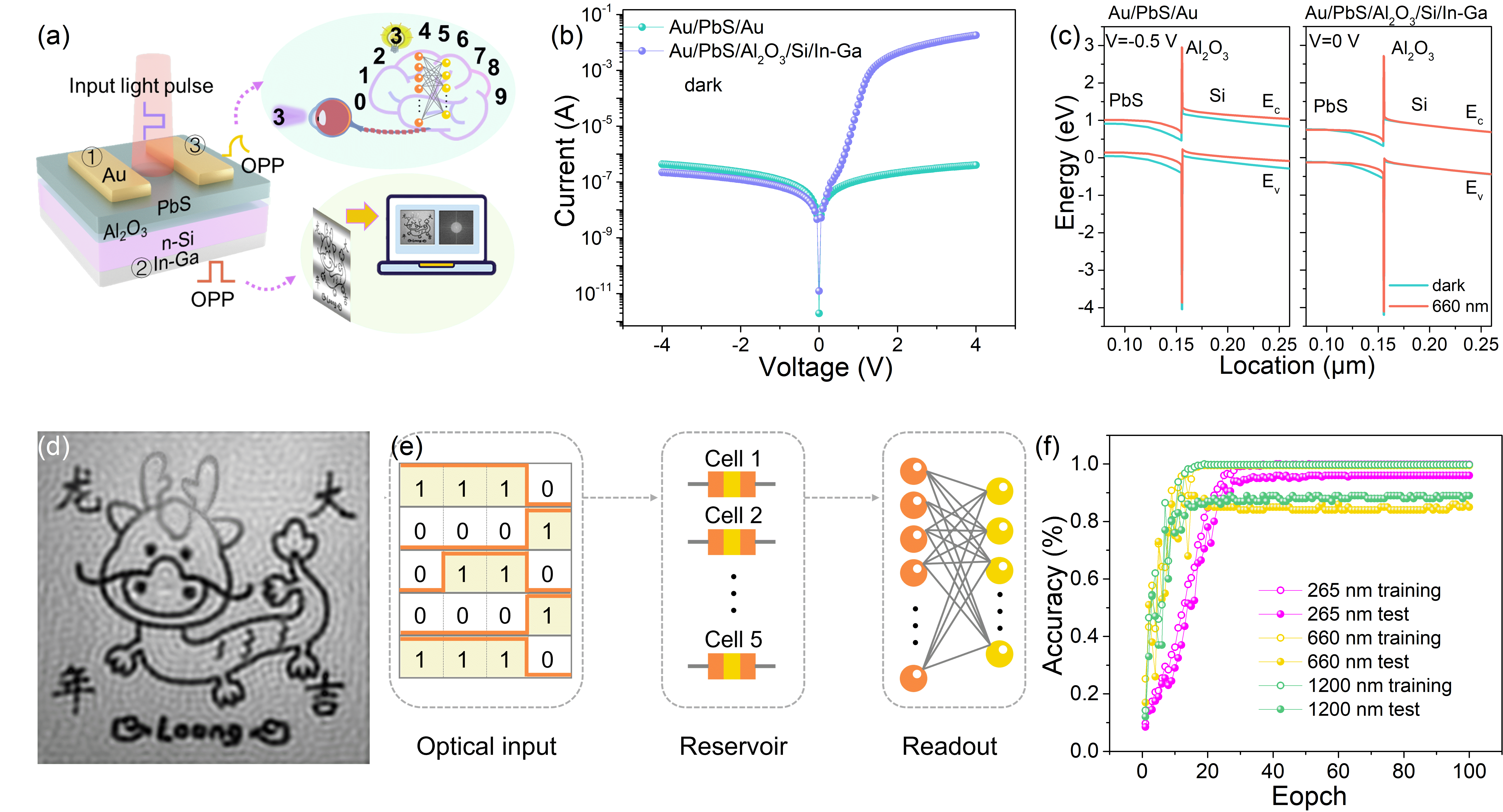 图1. (a)基于输出光电流脉冲(0PP)波形对光电探测器的功能进行分类;(b)在暗态下两种模式的 I–V 曲线;(c)不同模式下,器件在有光和无光条件下能带图的仿真结果;(d)在 7.79% 采样率下,利用单像素成像系统获得复现图;(e)用于标准数字识别的光电储备池计算示意图;(f)不同波长下标准数字识别的准确率。
