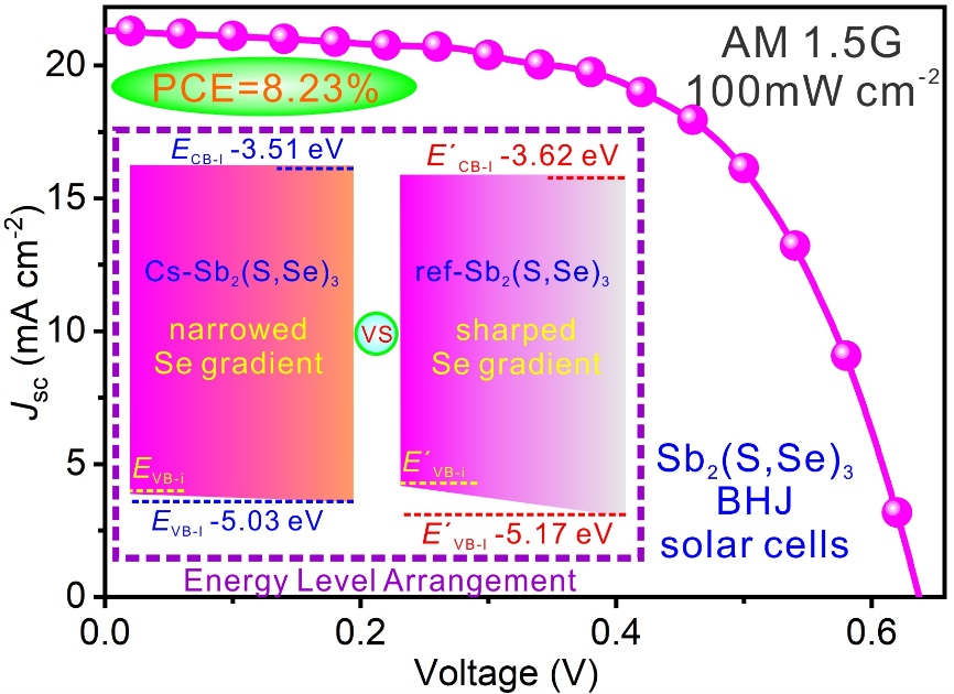 硒硫化锑(Sb₂(S,Se)₃)作为一种新兴光伏材料,因其优异的光电和结构特性备受关注。然而,目前基于溶液法制备的Sb₂(S,Se)₃光吸收层普遍存在能带结构排布失衡的问题。当前该领域研究主要聚焦平面异质结(PHJ)结构,然而在PHJ光电转换器件中由硒元素纵向梯度分布引发的非理想能带结构问题尤为突出,这会导致载流子传输路径受阻与复合比例增加。针对上述挑战,构建三维体异质结(BHJ)结构展现出独特优势:通过缩短载流子传输路径而降低复合损失,同时倍增的异质结界面面积可显著增强电荷分离效率。本研究创新性地提出了用碱金属Cs⁺离子诱导调控Sb₂(S,Se)₃薄膜中Se/S原子比的策略,缩小了Sb2(S,Se)3薄膜中的Se元素浓度的垂直梯度分布,从而产生了有利于光生电荷传输/分离的能带结构排布。