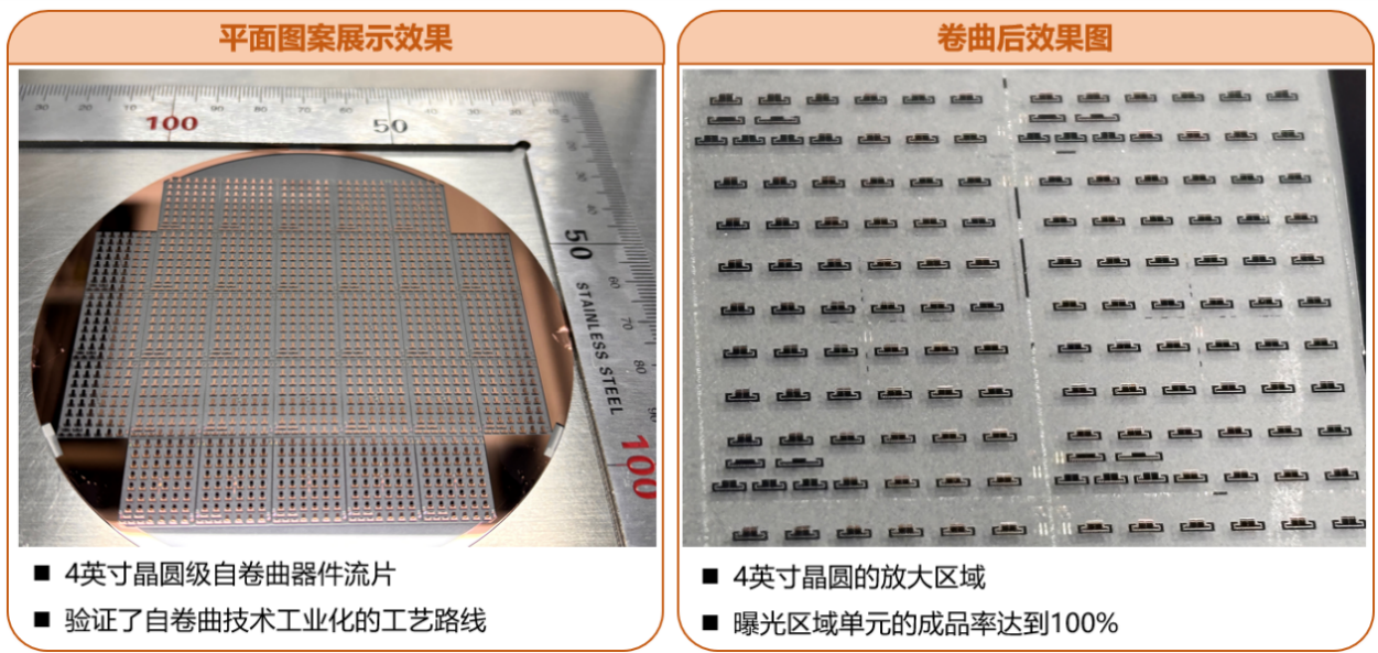图:基于金属驱动自卷曲技术工艺平台及在4英寸商用线批量制造的样品照片。