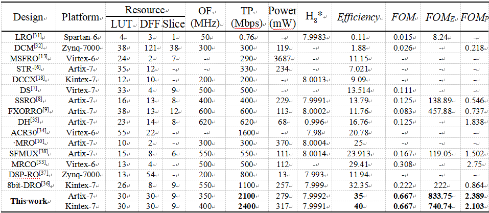 文章通过MATLAB对熵源电路进行了建模,仿真结果证明了内部节点输出的随机性和不可重复性。此外,采用Xilinx Artix-7和Kintex-7 FPGA对所提出的TRNG结构进行了硬件设计与测试。实验结果表明,所设计的TRNG在实现2.4Gbps吞吐率的同时具有较高的随机性和鲁棒性,在效率方面具有显著的优势。