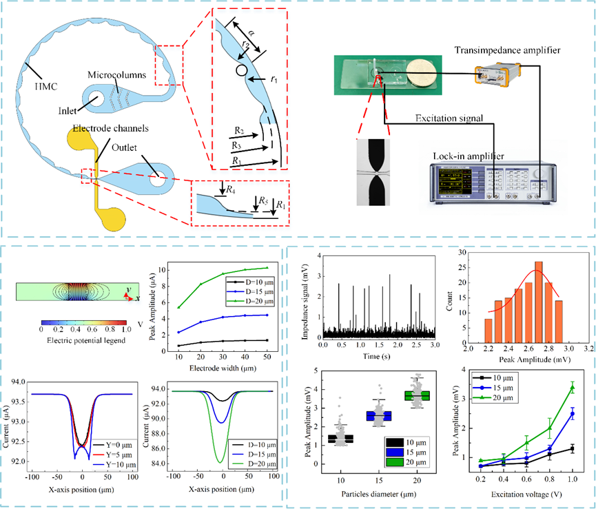 微流控阻抗细胞术因其结构简单、操作便捷和无需标记的优势,在细胞计数、药物筛选和疾病诊断等领域中被广泛应用。然而传统共面电极因电场分布不均,导致检测信号受微粒位置影响较大,降低了检测精度。为解决该问题,课题组开发了集成惯性微流控技术的阻抗式细胞计数芯片,利用增强型二次流实现微球在检测区域的高度聚焦,减少横向位置波动,同时引入液态金属三维对面电极,简化制造工艺并提升电极检测精度;采用软光刻结合反向抽取法制备微流控芯片,实现低成本、三维结构电极的快速构建;搭建细胞检测同步图像与电信号采集平台,开发相应数据处理算法,实现高达95%的聚焦效率,细胞计数变异系数低至7.9%,信噪比高达17.2dB,具备准确区分不同粒径微球的能力。该芯片与系统的开发在肿瘤细胞识别、免疫细胞监测以及微生物快速检测等领域具备广泛的应用前景,为便携式生物医学检测提供了新路径,有望推动精准医疗和智能诊断技术的快速发展。(Sensors and Actuators: B. Chemical,202410401532.X)