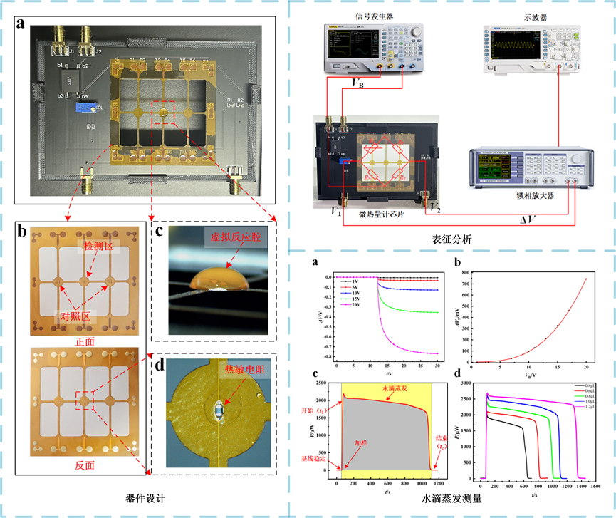 微热量计因其样品需求量少、检测速度快、测量精度高等显著优势,在细胞代谢动态监测、生物分子相互作用、药物-受体结合热分析等领域具有不可替代的作用。然而,现有高分辨率微热量计普遍采用MEMS工艺,通过复杂的光刻、刻蚀及真空封装技术制备微型反应腔与传感器阵列,导致成本高且制备周期长,制约其在低成本、高通量检测场景中的推广应用。课题组开发了一种基于柔性印刷电路的开放式微热量计芯片,以柔性聚酰亚胺薄膜为基底,集成表面贴装热敏电阻作为温度传感单元,结合开放式反应腔设计与差分信号处理电路,在常压环境下实现了15.4nW的功率分辨率和48.44µK的温度分辨率;搭建了热反应过程实时监控系统平台,对不同体积水滴的蒸发过程进行实时热监测,检测误差仅1.91%,充分证明了系统的高可靠性与抗干扰特性。课题组提出的柔性微热量计具有制备工艺简单、成本低廉及可批量生产的优点,为单细胞代谢热动力学、纳米材料热参数表征等研究提供了高性价比工具,并在便携式生化检测、高通量药物筛选及工业过程监控等领域展现出广阔的应用前景,有望推动精准医疗、生物制药及绿色化工技术的创新发展。(Sensors and Actuators: A. Physical,Cell Reports Physical Science,Fundamental Research,Nature Communications)