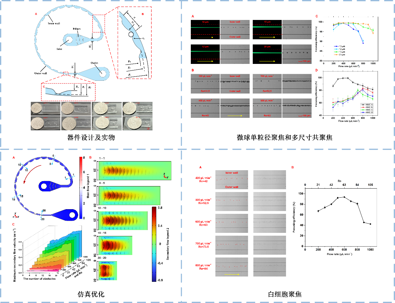 课题组主要聚焦于高精度白细胞三维聚焦及荧光检测技术,旨在解决传统微流控惯性聚焦技术中存在的聚焦精度不足和无法实现多尺寸细胞共聚焦的难题。课题组创新性地提出基于三维变截面组合式微通道和可变二次流的高精度细胞三维共聚焦方法,通过建立流体力学与粒子追踪有限元模型,揭示可变二次流的形成、调控及其对细胞的作用机制;采用双光子3D打印技术制备三维变截面微流控芯片,确保通道形貌精度与光学检测兼容性;结合样品驱动系统、高速显微观测系统和荧光信号采集与处理系统,开发了细胞多维度检测分析平台,成功完成了多尺寸微球和荧光标记白细胞的聚焦实验,验证了可变二次流的形成机制及其对细胞受力的动态调节,最终实现8-25μm宽粒径范围内微球和白细胞的高效三维共聚焦(聚焦效率>98%)。该技术为开发小型化、高通量、低成本的便携式细胞分析仪器提供了新方案,有望推动体外诊断、即时检测及单细胞分析领域的技术突破,助力打破国外技术垄断,提升我国生物医学产业的核心竞争力。(IEEE NEMS2021,MicroTAS 2022,Lab on a Chip,202410401383.7)