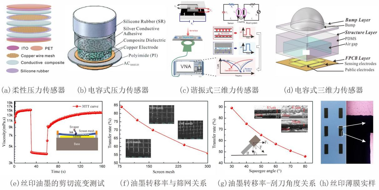 围绕电阻式原理和电容式原理开展了柔性力学传感器、三维力传感器、接近觉-触觉复合传感器和温度传感器等一系列工作,见图3(a-d)。借助丝网印刷工艺制作双应变敏感层结合裂纹结构的力学传感器,并分析了网版目数和刮板角度等对传感器性能的影响,如图3(e-h)所示。所制备的传感器GF高达2000,重复性好、迟滞回差小(7.1%)、响应时间短(约70毫秒)。