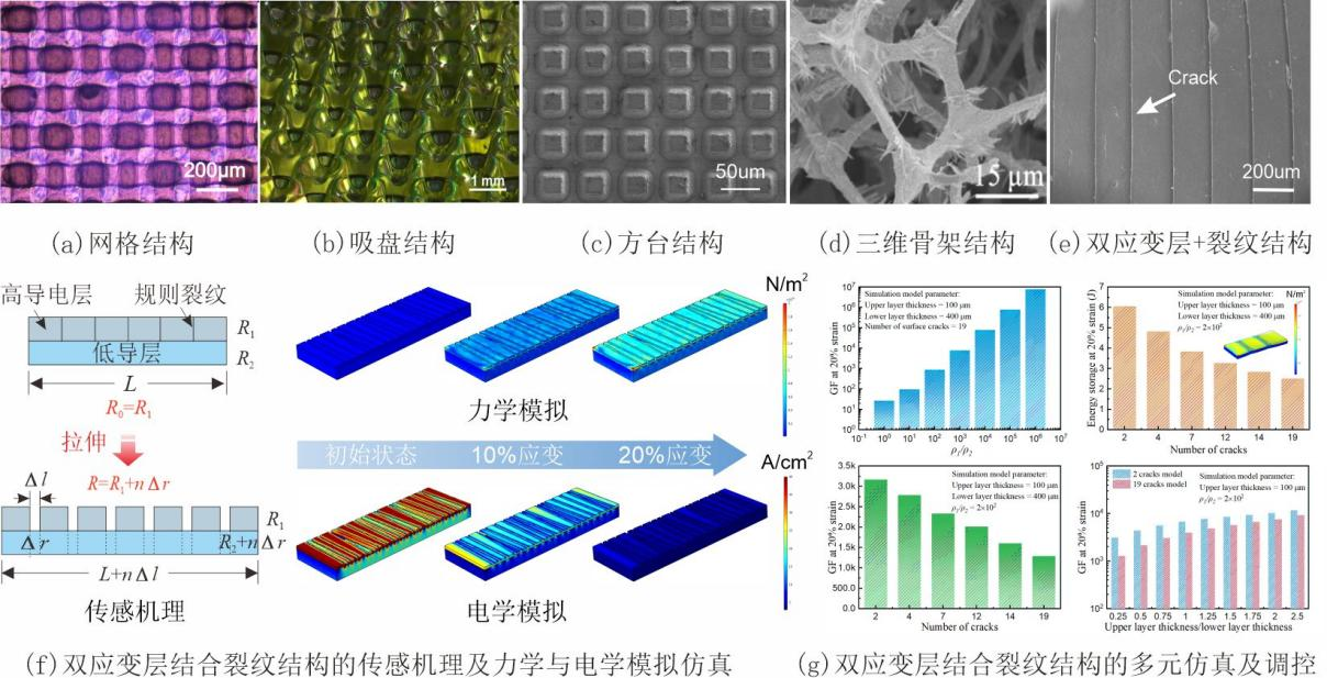设计了如网格、吸盘、方台、三维骨架等微纳结构,如图2(a-d)所示。发现微纳结构可以提升传感性能,发明了基于双应变层结合裂纹结构的电阻式超灵敏宽工作范围应变传感器,部分研究如图2(e-g)所示。研究表明,双应变敏感层结合裂纹结构可以构筑超灵敏和高重复性力敏传导通路,灵敏系数可高达2000。