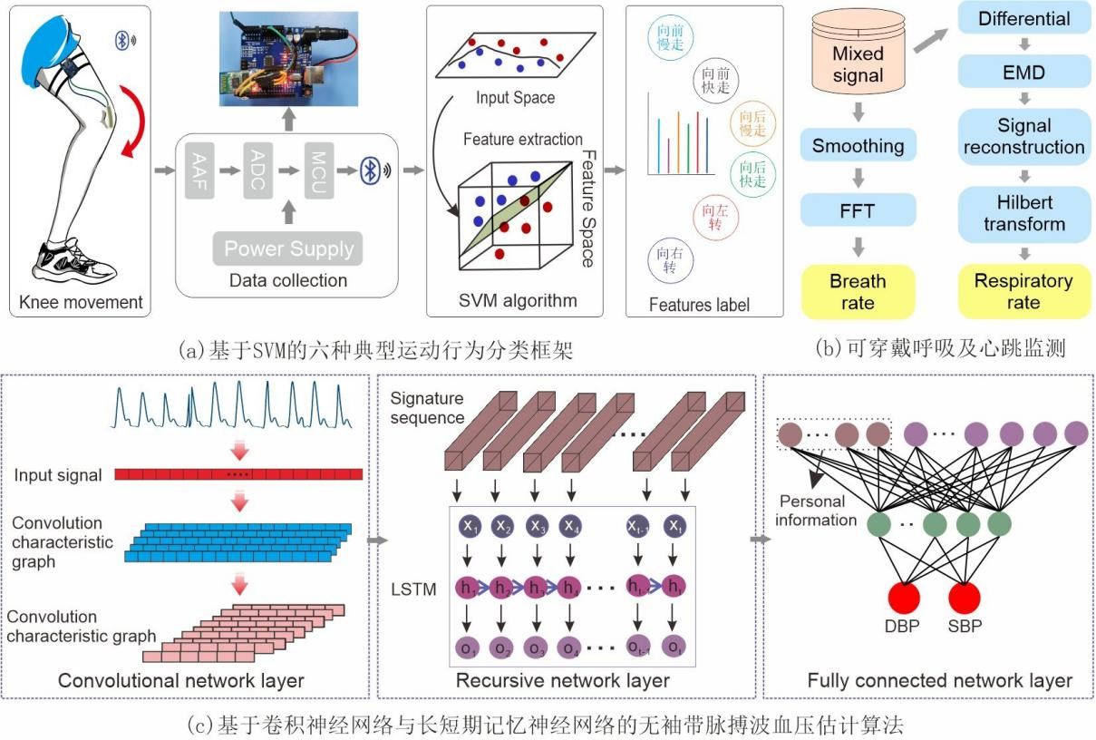 将安装于膝关节的传感器采集的信号通过数据预处理后传输至微控制器中,利用支持向量机分类算法识别六种运动模式,整体识别准确率在70%以上,见图5(a)。将柔性传感器编织到衣物中来检测心脏的跳动,配合傅里叶变换和希尔伯特-黄算法可以获取人体的呼吸率和心率,误差分别小于2%和3%,见图5(b)。基于卷积神经网络自动提取脉搏波的特征,利用长短期记忆神经网络将前后特征相互关联,再使用全连接网络层预测当前血压值,所预测的血压结果符合美国医疗器械协会和英国高血压协会的A级标准,见图5(c)。
