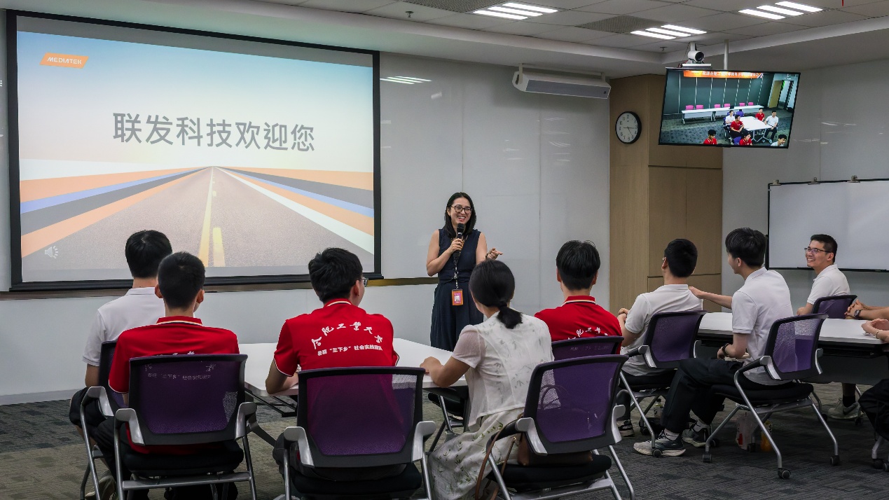 在企业传播与公共事务部负责人董倩倩的带领下,实践团队参观了公司的办公区、技术展示中心以及员工社团娱乐区。作为全球领先的IC设计企业,联发科技在智能终端、移动通信、AI处理器等领域具有显著优势。通过现场讲解与互动交流,团队对企业技术布局、产品创新以及全球化发展战略有了更直观的认识,也对合肥作为国家集成电路产业重要基地的产业生态有了进一步了解。员工社团娱乐区的参观,则让同学们感受到公司对员工工作生活平衡的重视与浓厚的人文关怀。