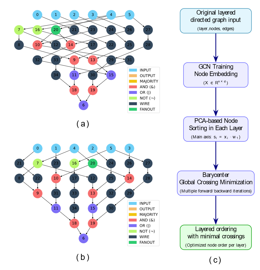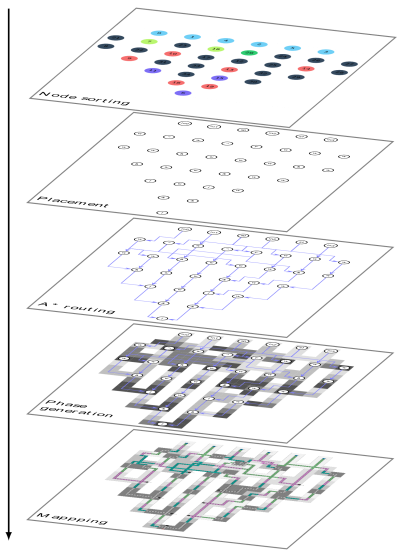 为此,团队开发iFCN平台,实现了从RTL电路输入到器件级版图输出的完整自动化设计流程。平台在底层引入Morton编码驱动的四叉树数据结构,统一建模空间与时钟资源,提升版图的紧凑性与可扩展性;在放置优化中,融合图卷积网络(GCN)学习的拓扑嵌入特征,引导层内排序与递归划分,有效降低交叉线,提升布局质量;在布线环节,设计了支持多扇出路径复用的改进型A*路由算法,提升布线成功率与连通性;在顶层策略中,提出轻量级自适应时钟相位分配机制,并研发了支持多层电路结构的门级到器件级映射算法,可直接对接项目组自研的高效单稳态与双稳态仿真模型,实现从逻辑设计到物理验证与能耗评估的闭环集成。