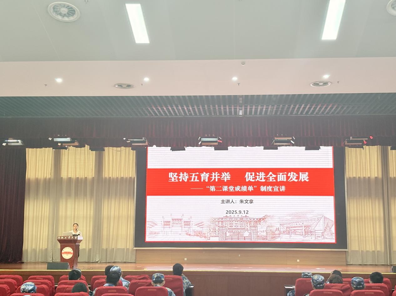 9月12日,我院于翡翠湖科教楼A座二楼报告厅举办了以“坚持五育并举 促进全面发展”为主题的“第二课堂成绩单”制度宣讲讲座。学院团委书记朱文拿老师主讲,2025级全体新生参加了该场讲座。