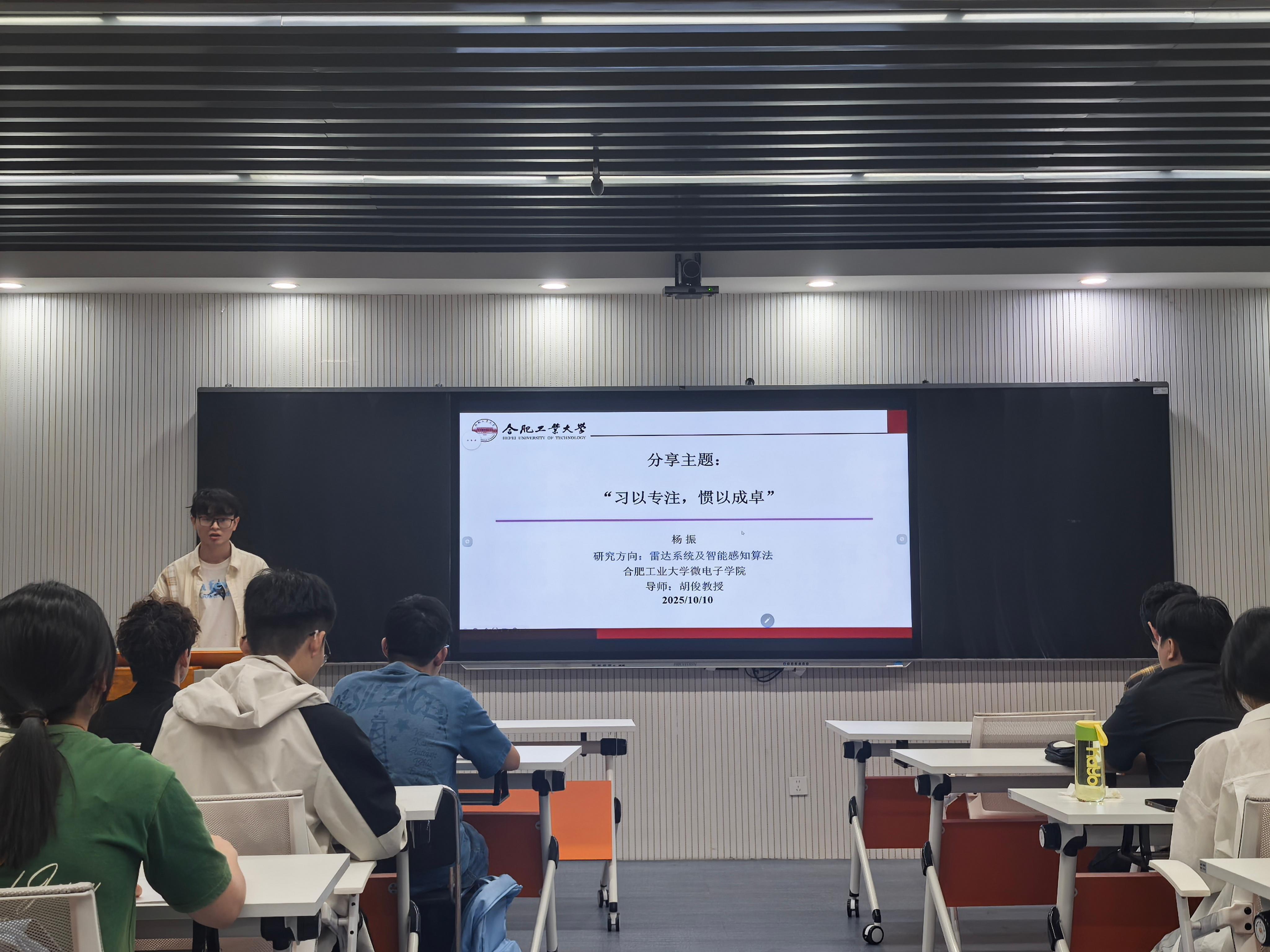 10月10日下午,必赢线路检测3003在翡翠湖校区科教楼A座1821室成功举办第179期斛兵青年说活动。活动以“习以专注,惯以成卓”主题,邀请学院2023级新一代电子信息技术专业硕士研究生杨振作经验交流分享会。学院30余名研究生参加了本次活动。