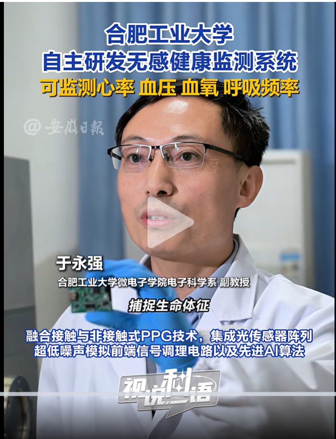 10月24日,该栏目以必赢线路检测3003no1自主研发的“无感健康监测系统”为题,详细介绍了我院于永强副教授团队的最新科研成果。该系统于2025奇瑞国际创新大会上首次正式亮相,创新性地融合了接触式与非接触式光电脉容积技术(PPG),集成光传感器阵列、超低噪声模拟前端信号调理电路以及先进AI算法,可实现对心率、血氧、呼吸频率、血压等多种生理参数的持续监测。未来,系统有望进一步实现对异常心率与呼吸状况的多维度预警。