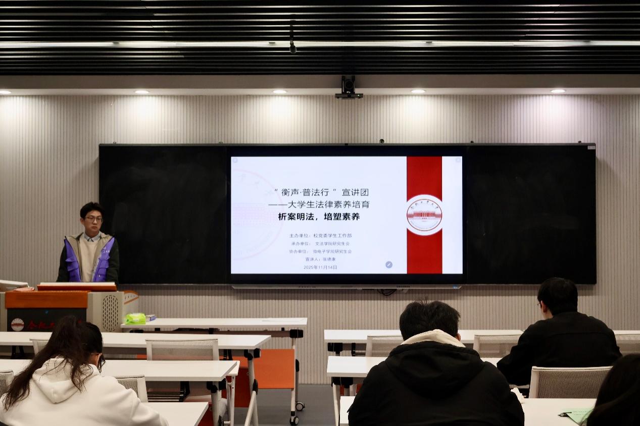 为将法律素养纳入研究生全面发展培养过程,助力培养兼具专业能力、法治思维与社会责任感的复合型人才,近日,“衡声·普法行”普法宣传活动在翡翠湖校区科教楼A座1821室圆满举行,吸引来自学院四十余名研究生参与。