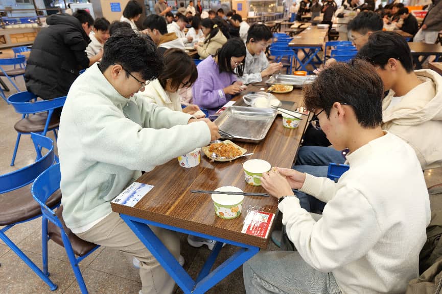 随后,同学们三到五人为一组,食堂工作人员给每组分发饺子皮和馅料,由同学们自行包饺子。虽然很多同学都是初次尝试包饺子,手法略显生疏,但每个人都乐在其中,不时传来欢声笑语。不少同学还发挥创意,尝试包出不同形状和图案的饺子,让这场活动更添了趣味性。大家在包饺子的过程中,不仅学习到了包饺子的技巧,还交流了各自的家乡习俗和冬至的庆祝方式,增进了彼此之间的了解和友谊。经过一个多小时的努力,随着一盘盘热气腾腾的饺子端上桌,同学们围坐一起,饺子的香味和同学们的欢声笑语交织在一起,共同品尝自己的劳动成果,幸福感满满。