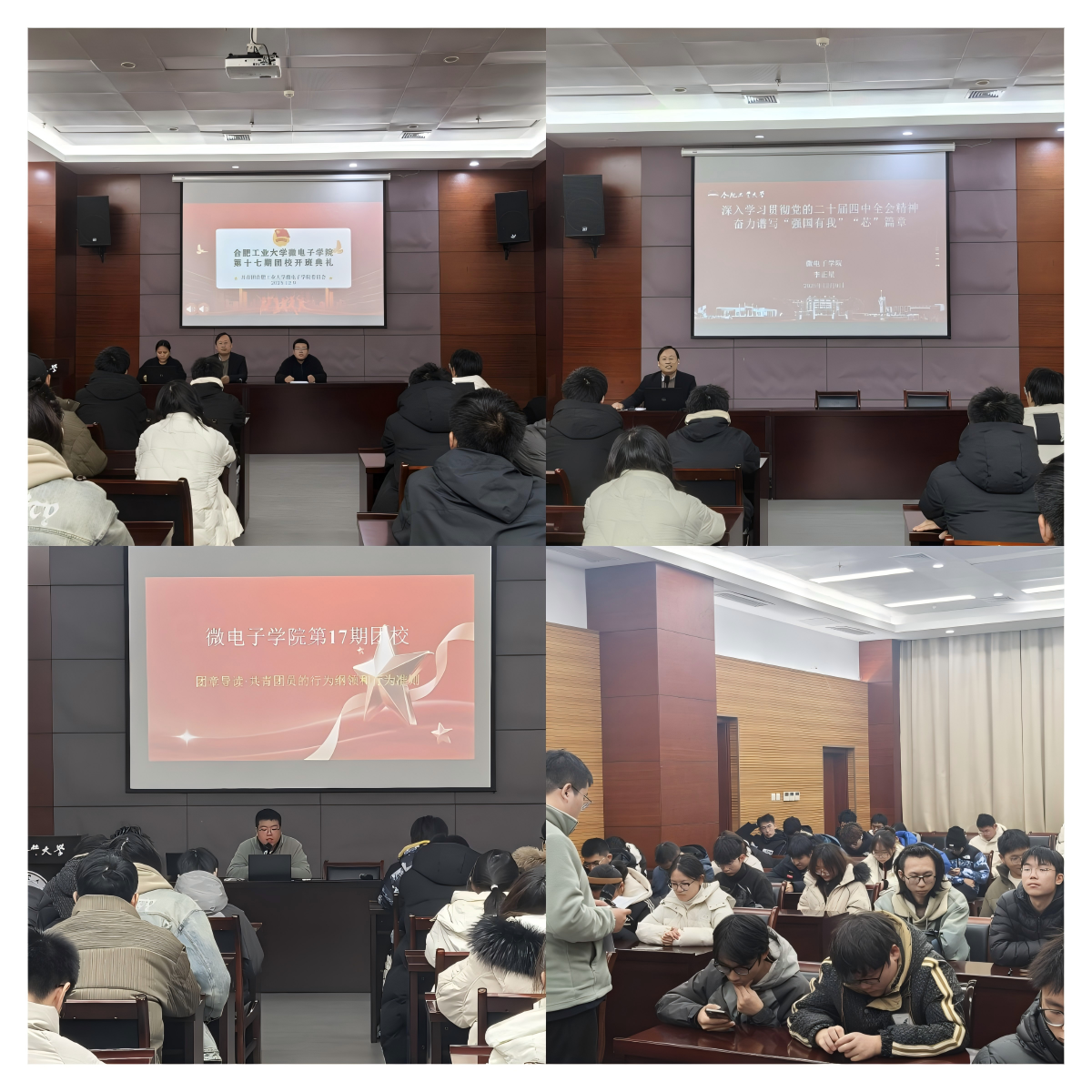 仪式强基,凝心聚力筑信仰。2025年12月上旬,团校开班仪式举行,全体人员肃立齐唱团歌,凝聚思想共识。学院团委书记朱文拿老师做动员讲话,说明课程安排与纪律要求,勉励学员珍惜机会、筑牢信仰。学员代表潘弘益表态将高标准完成学习任务。学院党委副书记李正星老师做“深入学习贯彻党的二十届四中全会精神 奋力谱写‘强国有’‘芯’篇章“主题团课,结合党的二十届四中全会精神,阐释青年大学生工业报国追求,勉励学员立足专业对接国家战略,以习近平新时代中国特色社会主义思想武装头脑,将个人理想融入民族复兴伟业,成长为青年骨干。