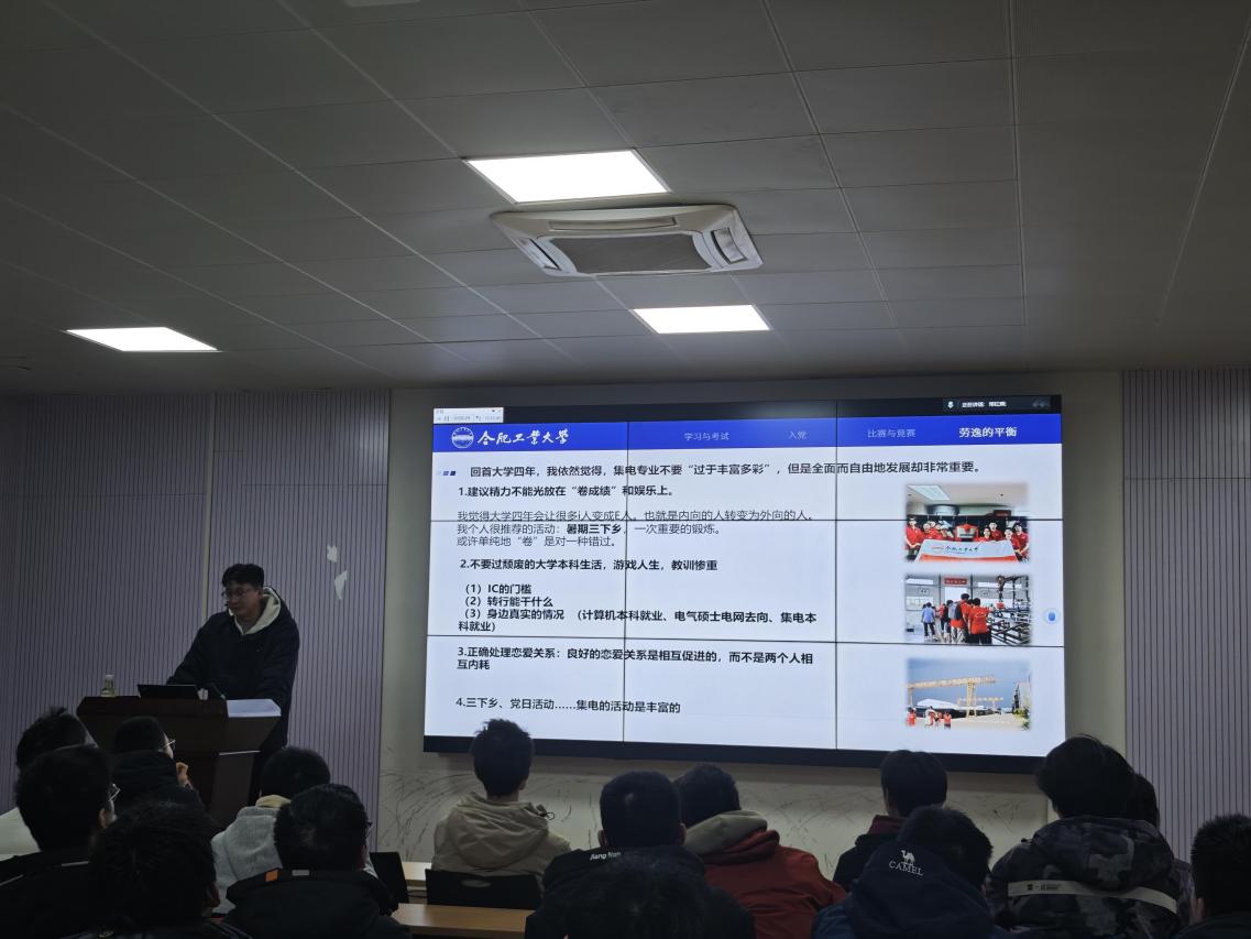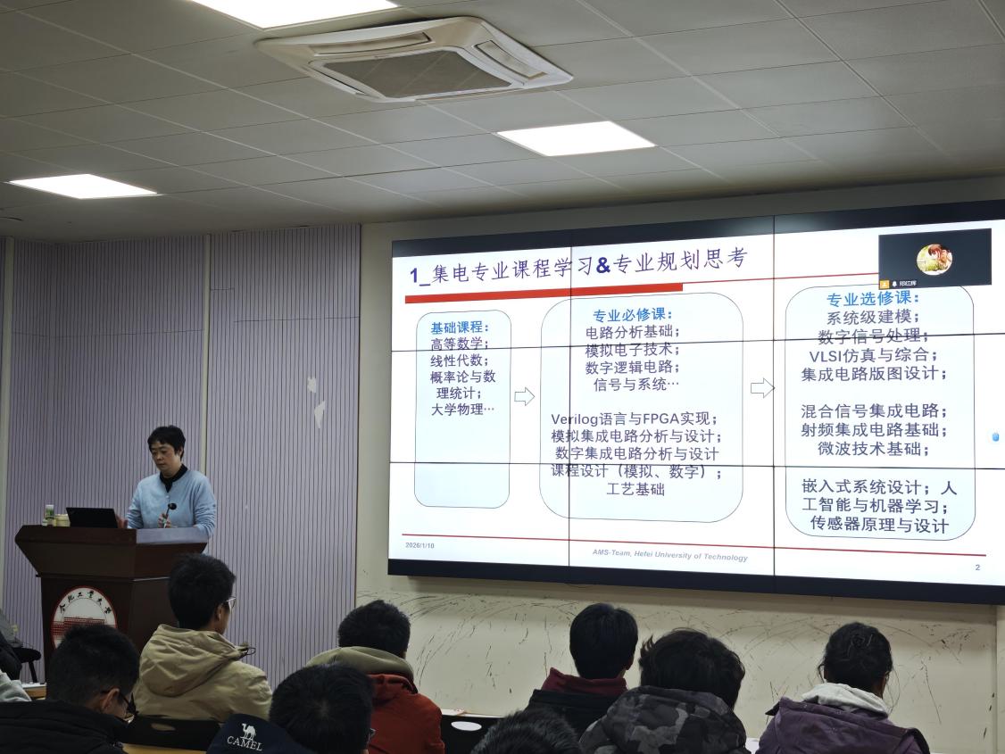 在学长分享环节,2020级集电专业章前昊以集成电路产业发展历程为脉络,从早期灯泡工作原理到摩尔定律的演进,再从英特尔4004芯片到苹果A19 Pro芯片的技术突破,通过行业发展的关键节点引导同学们跳出表面认知,深入思考技术迭代背后的底层逻辑与创新本质。2022级集电专业王海屹则聚焦课程学习的实际问题,针对电路分析等核心课程的学习难点,梳理了数字、模拟及混合信号方向的核心课程体系与学习方法,分享了兼具实用性与针对性的学习技巧。2022级集电专业齐宣懿结合自身丰富的竞赛经验,从科研竞赛的“交融、回归、寻找、探索”四个维度,剖析了竞赛对知识实践与个人成长的意义,并强调团队协作中的沟通、包容与质疑精神,这些能力的培养比专业知识本身更具长远价值。