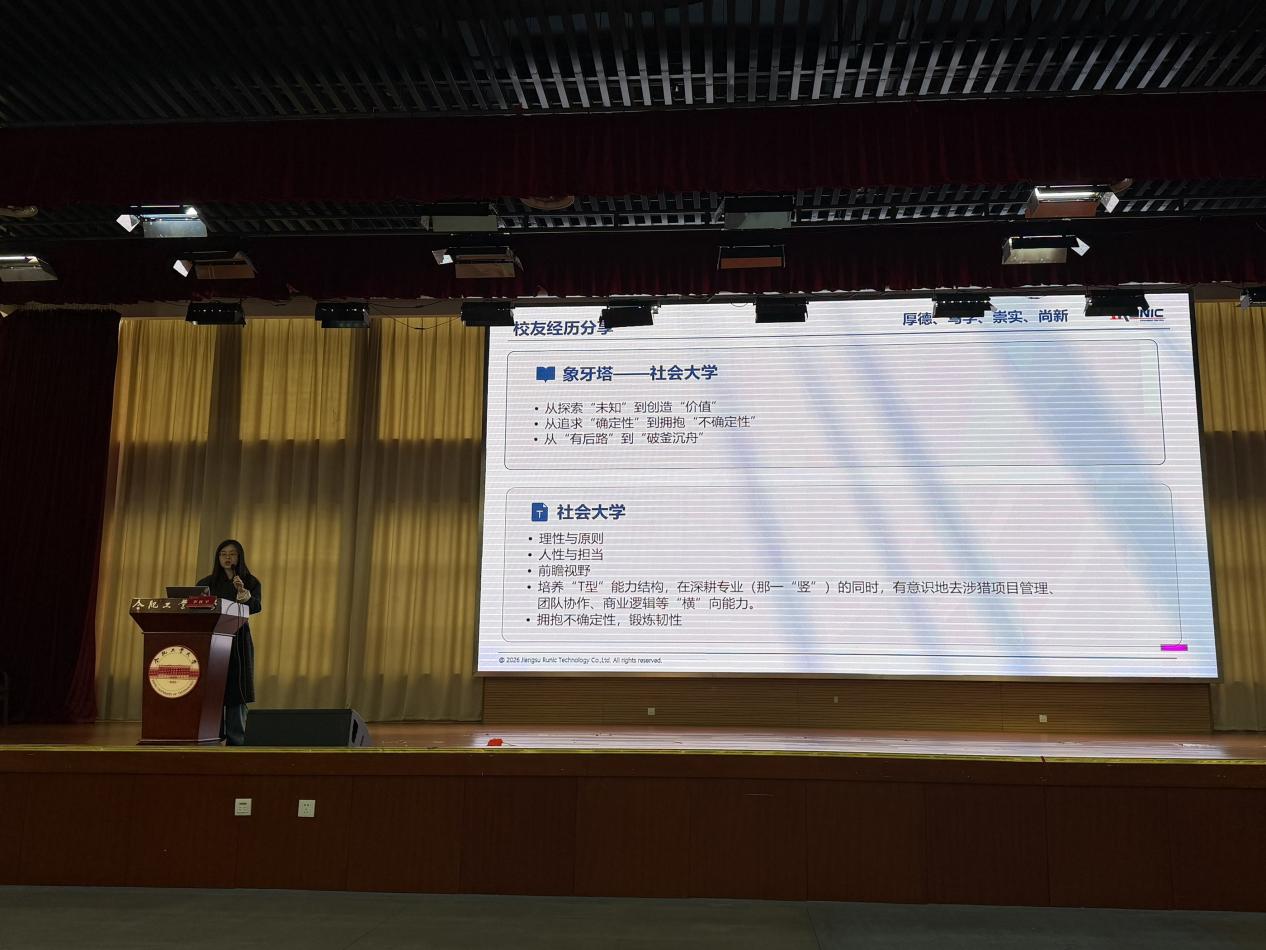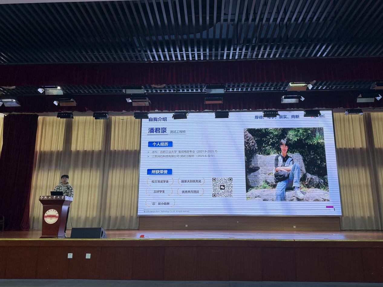 随后举行了大学生职业生涯主题报告会。本次大会特邀江苏润石科技有限公司四位企业代表、优秀校友返校分享。2008级校友李秋平校友现任公司副总经理,分享了从必赢线路检测3003no1本科起步,到北京大学完成硕、博、博士后阶段深造的完整成长路径。她深耕微电子领域多年,累计授权专利十余项、发表学术论文30余篇。她勉励同学们夯实专业基础、保持科研热忱,把个人成长融入国家集成电路产业发展大局。黄修城现任公司应用测试副经理,他从中山大学临床医学专业转向芯片领域,快速完成赛道转型并成长为技术与管理骨干,为同学们提供了跨领域发展的鲜活范例。余依未、潘君豪两位校友作为学院2025届本科毕业生,两位分别担任应用工程师、测试工程师,他们以“芯”翼小萌新的视角,分享从校园到职场的衔接经验,二人从课程学习、实践锻炼、求职准备、岗位适应等方面,为本科生提供具体可行的成长建议。